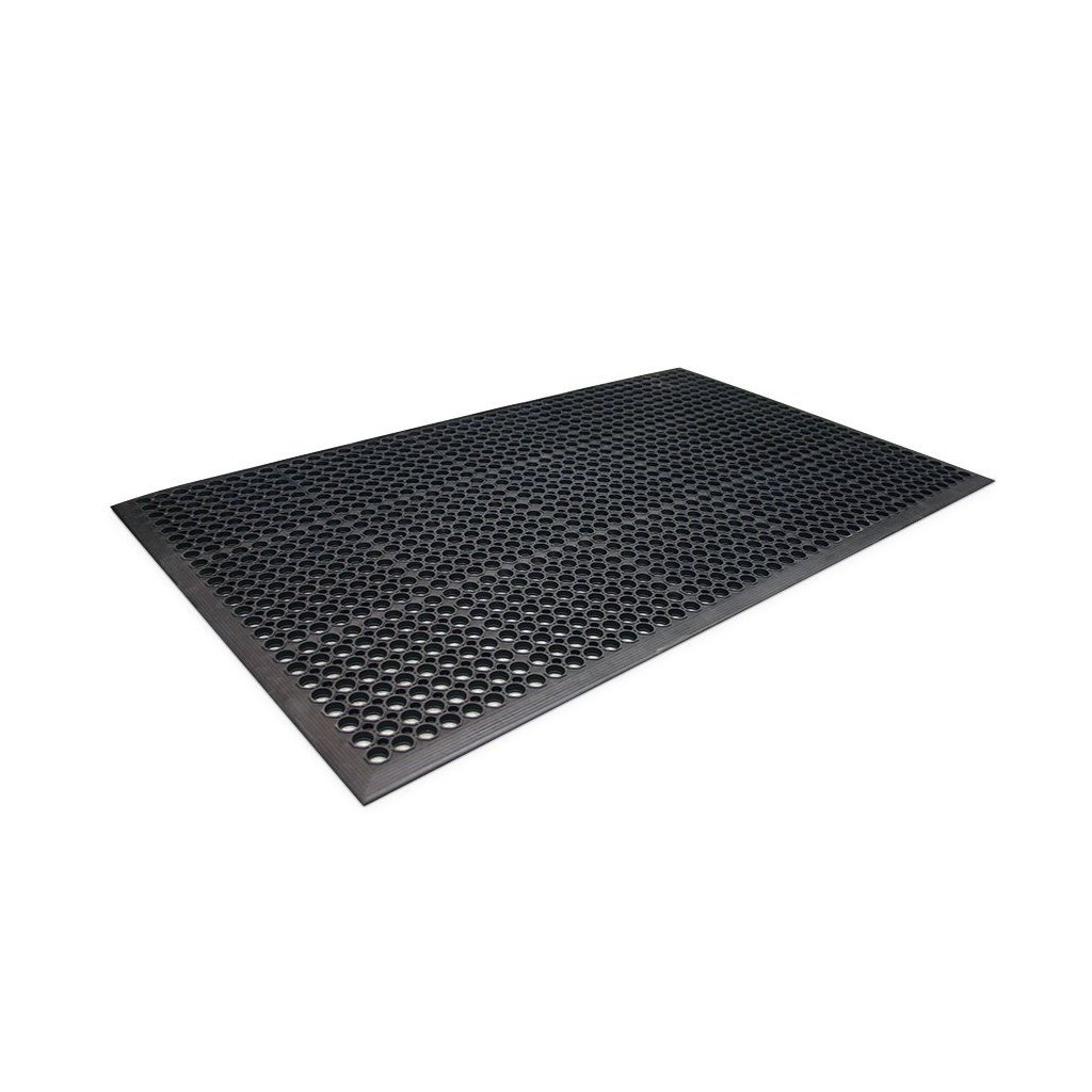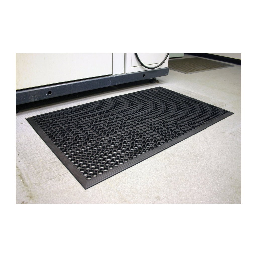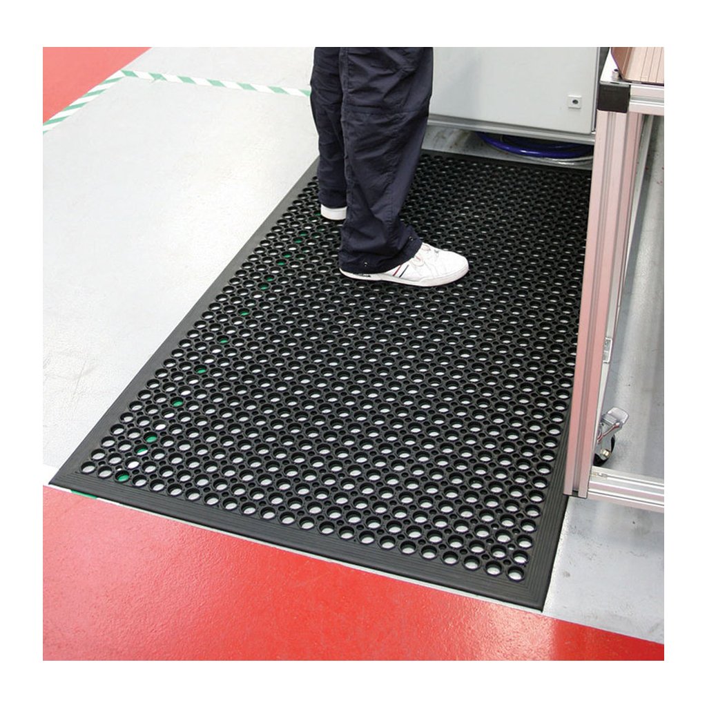 Ekonomická protiúnavová rohož s otvory pro odtok tekutin. Vzorkovaný kruhový povrch zaručuje ochranu proti uklouznutí, lisovaná náběhová hrana pak ochranu proti zakopnutí.