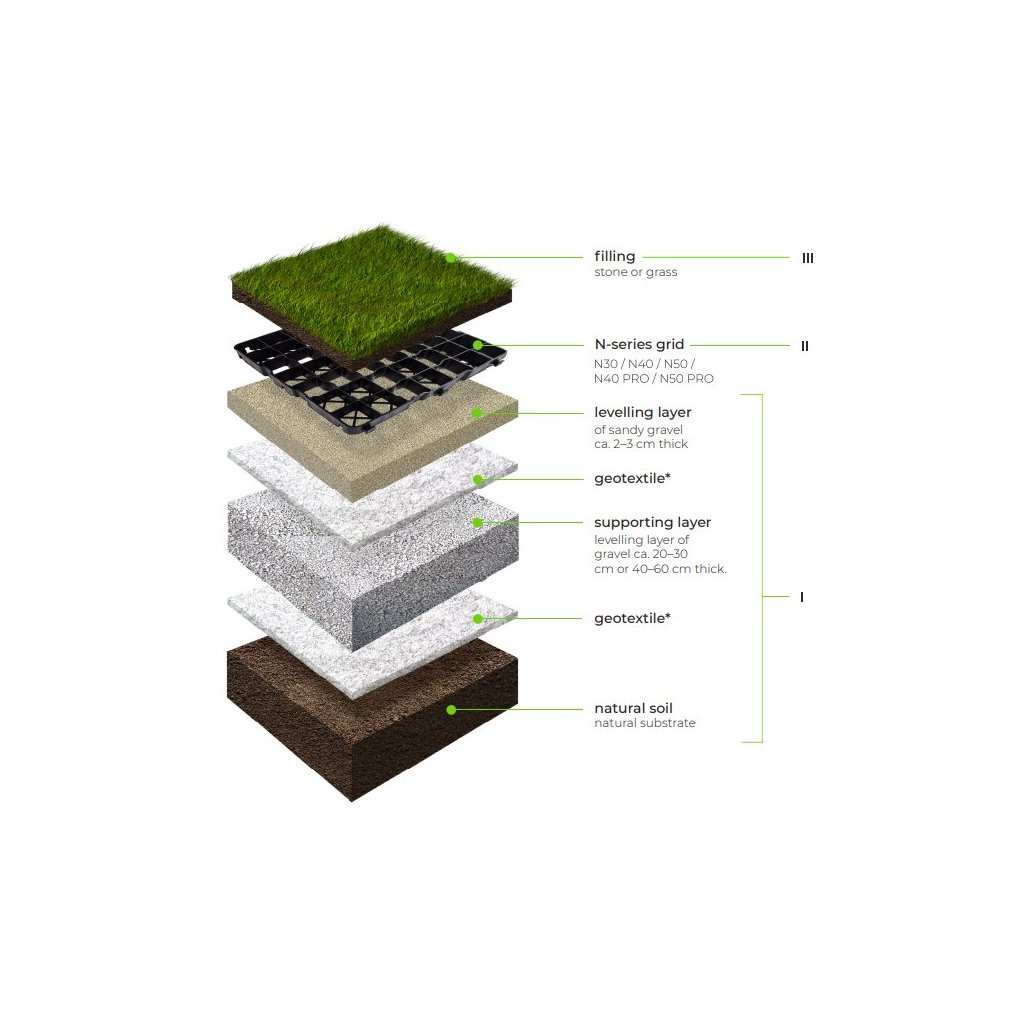 Plastová zatravňovací dlažba je vhodná zejména pro soukromá parkoviště, na příjezdové cesty ke garážím, turistické stezky, cyklostezky, cesty v zahradách a parcích, komunikace na golfových hřištích, zpevněné a obslužné plochy kolem staveb (štěrková drenáž), apod. Tato dlažba s výškou 3 cm není ideální pro zatravnění, vhodná je spíše výplň štěrkem, drobným kamenivem, keramzitem, pískem, apod.