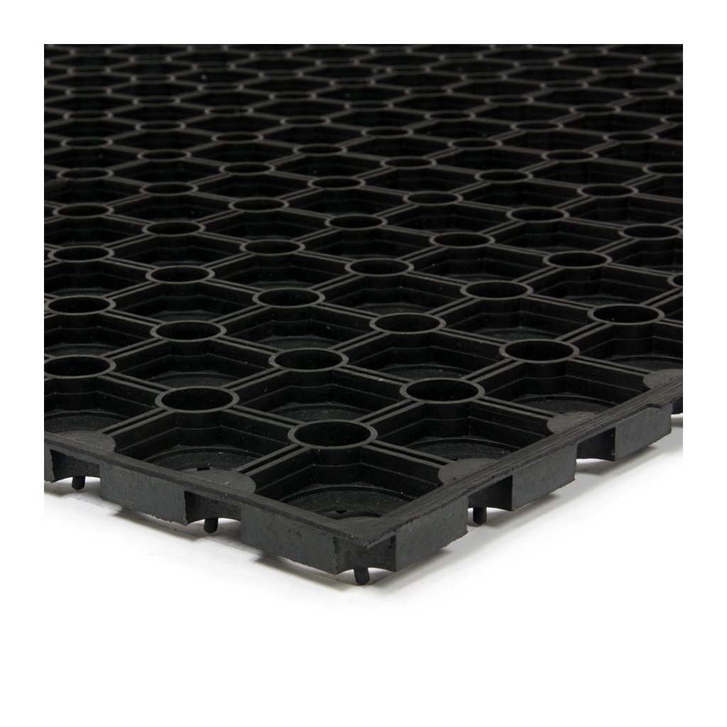 Venkovní gumová vstupní rohož Honeycomb je vhodná pro odstranění hrubých nečistot jako je sníh a bahno. Tuto rohožku nejčastěji vidíte jako vstupní čistící rohož u vstupů do budov. Lze použít také jako zatravňovací rohož pro zatravnění namáhaných ploch.