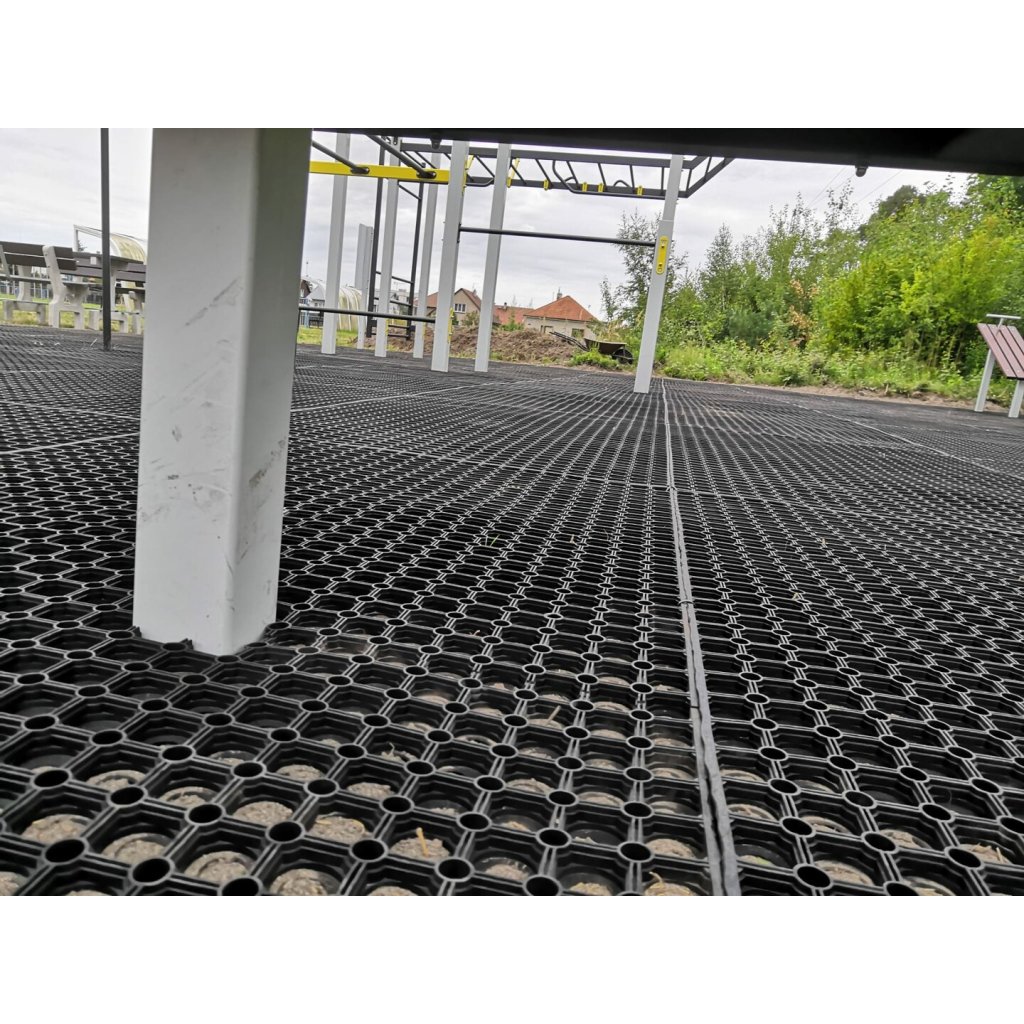 Venkovní gumová vstupní rohož Honeycomb je vhodná pro odstranění hrubých nečistot jako je sníh a bahno. Tuto rohožku nejčastěji vidíte jako vstupní čistící rohož u vstupů do budov. Lze použít také jako zatravňovací rohož pro zatravnění namáhaných ploch.