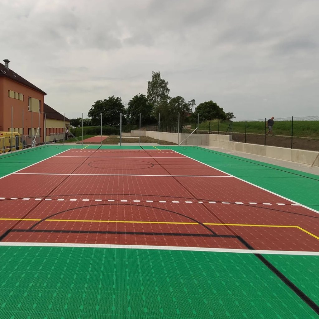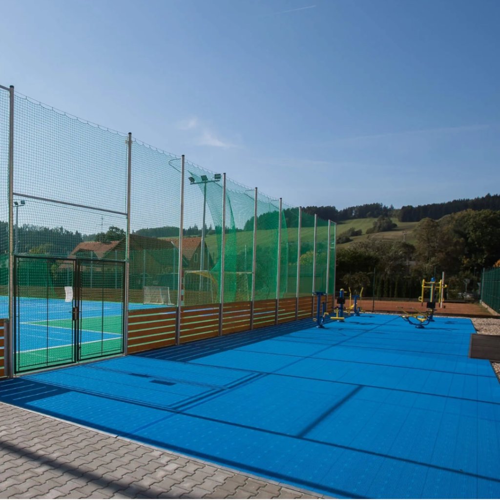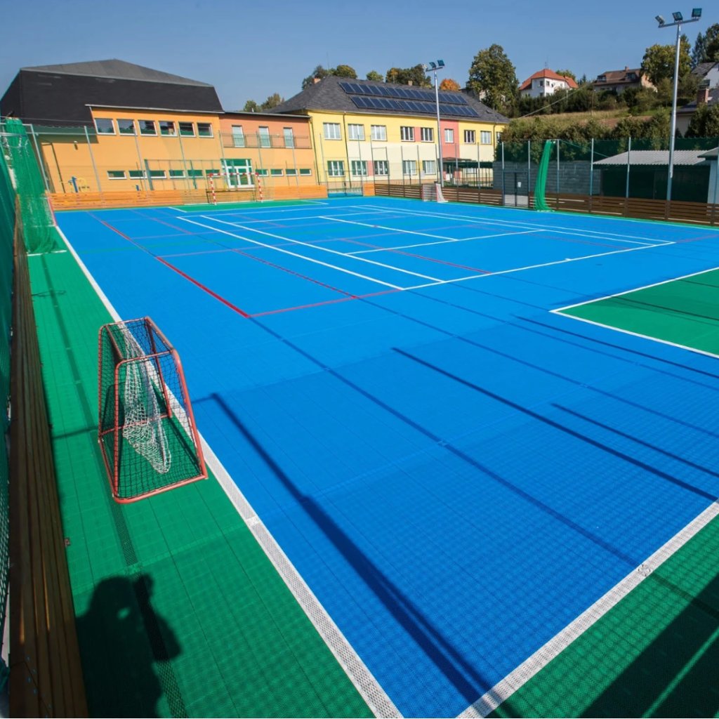 Plastová sportovní dlažba pro tenis, badminton, nohejbal a další venkovní sporty. Poskytuje skvělý protiskluz, jistotu při dopadech a odolnost vůči teplotním výkyvům. Snadná montáž, recyklovatelný materiál, barvy: červená, modrá, světle modrá, šedá.