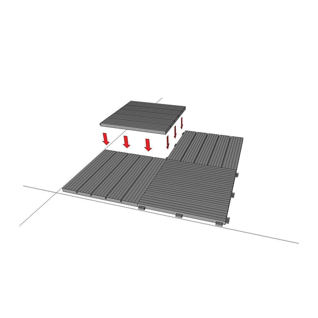 Zámkový systém umožňuje rychlý a jednoduchý způsob pokládky i rozebrání. Díky bočních spojovacích háčku je instalace dlažby velmi jednoduchá a hlavně rychlá.