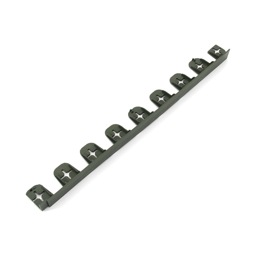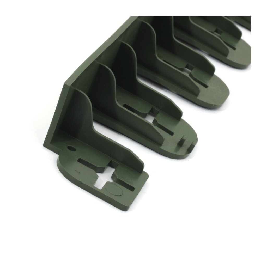 Pro fixaci obrubníku je potřeba dokoupit kotvící hřeby. Pro měkké podloží postačí plastové kotvící hřeby, pro pevnější (jílovité) podloží volte kovové hřeby. Plastový obrubník se kotví k zemi pomocí 9 ks kotvících kolíků na 80 cm. Po ukotvení se dosype plastový obrubník zeminou do požadované výšky.